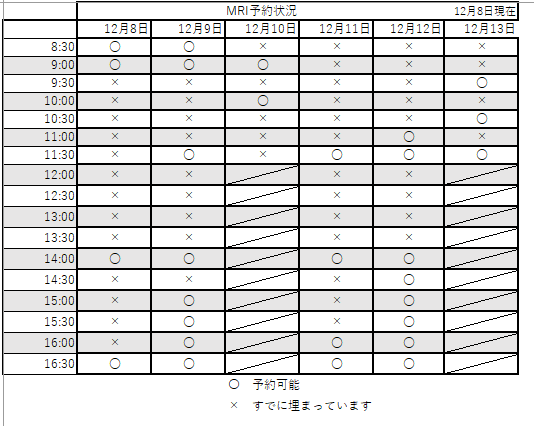 今週のMRI予約状況です。こちらは12月8日㈪8:00現在の情報です。
