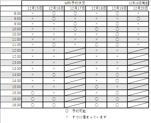 今週のMRI予約状況です。こちらは12月15日㈪8:00現在の情報です。