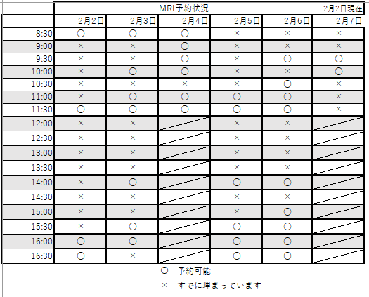 今週のMRI予約状況です。こちらは2月2日㈪8:00現在の情報です。