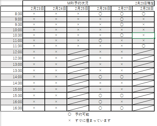 今週のMRI予約状況です。こちらは2月23日㈪8:00現在の情報です。